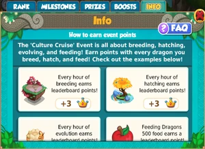 The 'Culture Cruise' Event was all about breeding, hatching, evolving and feeding. Earn points with every dragon you breed, hatch, and feed.